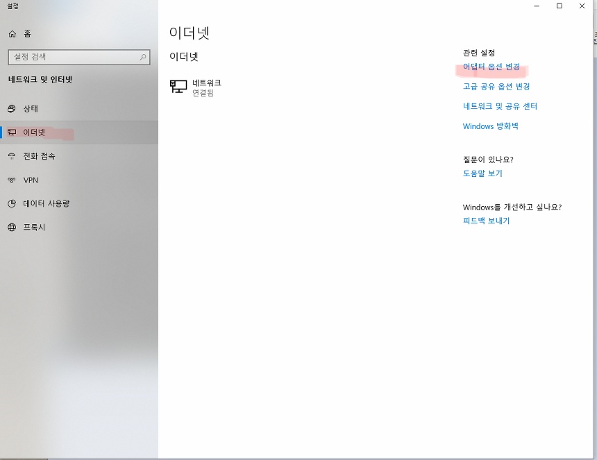 2. 창이뜨면 왼쪽 이더넷 클릭 - 어댑터 옵션 변경 클릭