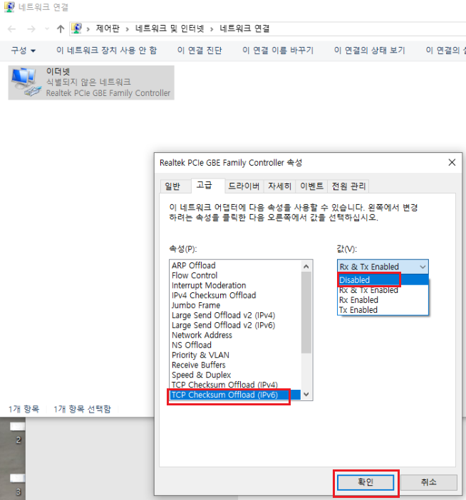 속성 TCP Checksum Offload (IPv6), 값 Disabled 로 설정