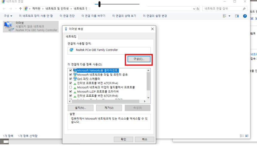 3. 이더넷 마우스 오른쪽 클릭 - 속성 클릭 - 구성 클릭