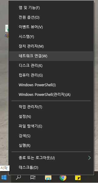 1. window 버튼에서 마우스 오른쪽 클릭 - 네트워크 연결(W) 클릭