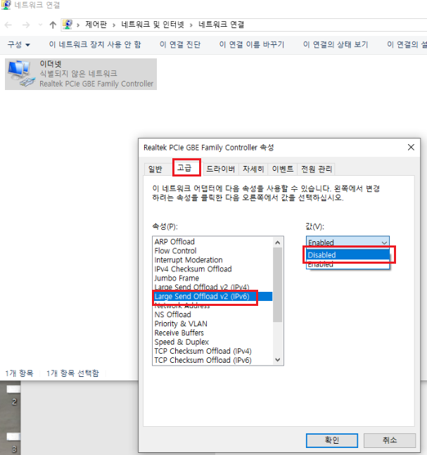 4. 상단 고급 탭 클릭 - 하단 속성 Larae Send Offload v2 (IP6), 값 Disabled 로 설정