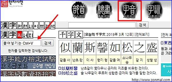그럼 이름 한자 찾기 뜻풀이 방법을 알아보자. 존 한자 사전에서 찾아보면 다음과 같다. 메인 홈페이지에 접속한 후 한글을 아무 글자나 검색해 본다. 또는 상단 자음 색인에서 음으로 찾기를 선택해서 들어간다.