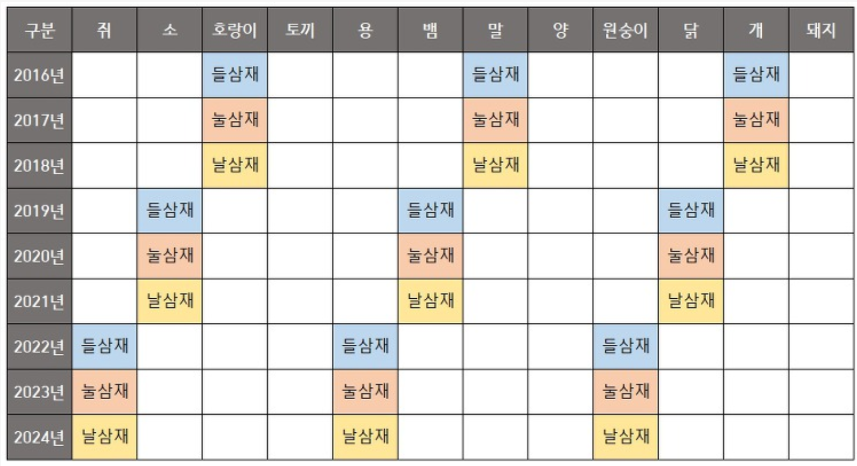 안녕하세요. 오늘은 2020년 삼재띠는 무엇이고 어떻게 무엇을 해야할까요? 일단 표를 보시면 일단 나오는 것들이 있습니다. 2020년 의 삼재가 들어갔는것들이요. 그리고 들삼재, 놀삼재, 날삼재등 이것을 합체서 삼제라고 부릅니다.