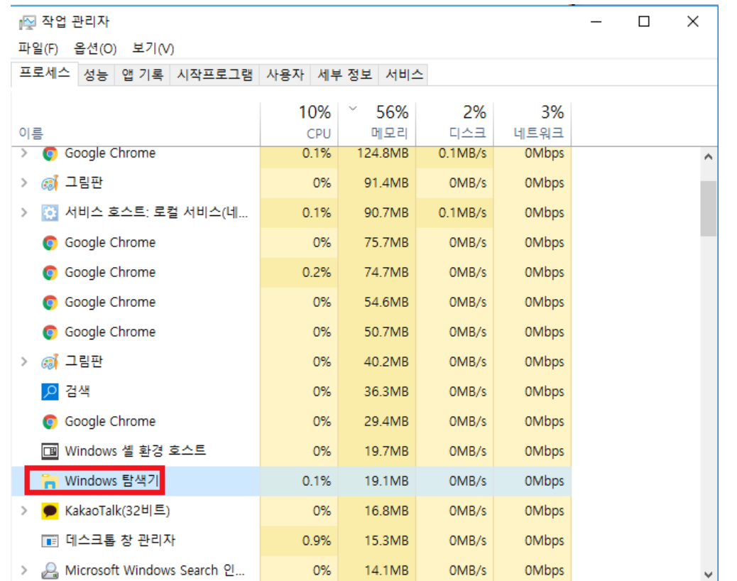 이후 프로세스 탭에서 Windows 탐색기를 [다시 시작]하여 실행했으면 깔끔하게 해결된 것을 볼 수가 있었습니다~!