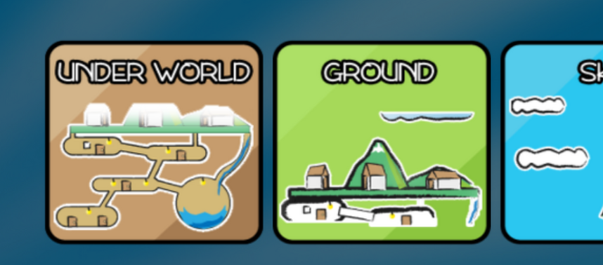 Select World라고 맵을 먼저 선택할 수 있습니다. 쭉 보신 후 재밌어 보이는 걸 선택해서 플레이해보세요. 앞에 보이는 맵으로는 under world, ground, sky 가 있었습니다.